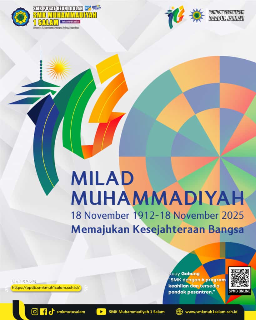 <p>Selamat</p><p>MILAD PERSYARIKATAN MUHAMMADIYAH KE-113</p><p>"Memajukan Kesejahteraan Bangsa"</p><p>..................................</p><p>SMK Muhammadiyah 1 Salam sudah membuka Sistem Penerimaan Murid Baru (SPMB) tahun ajaran 2026/2027, yaa.</p><p>PROGRAM INDEN<br>Terbatas, hanya bulan ini sampai akhir November saja..!!</p><p>Yuuuk.. Segera datang ke kampus SMK kita. Pelayanan SPMB kita buka setiap hari di hari kerja.</p><p>Bagi kalian yang jauh dari kompleks, boleh hubungi nomor kita yang tertera di bawah.</p><p>Yang di luar Magelang dan sekitarnya, kita juga tersedia pondok pesantren ya.</p><p>SEGERA DAFTARKAN DIRI ANDA, SEBELUM PENUTUPAN PENDAFTARAN🚨💥<br>.<br>.<br>Ayo..<br>Bergabung dan raih masa depan bersama kami..!!</p><p>SPMB TA 2026/2027 SUDAH DIBUKA<br>Informasi SPMB, 0853 8589 2352 (Bapak Suhardi)</p><p>Link SPMB<br>👉🏻https://spmb.smkmuh1salam.sch.id</p>
